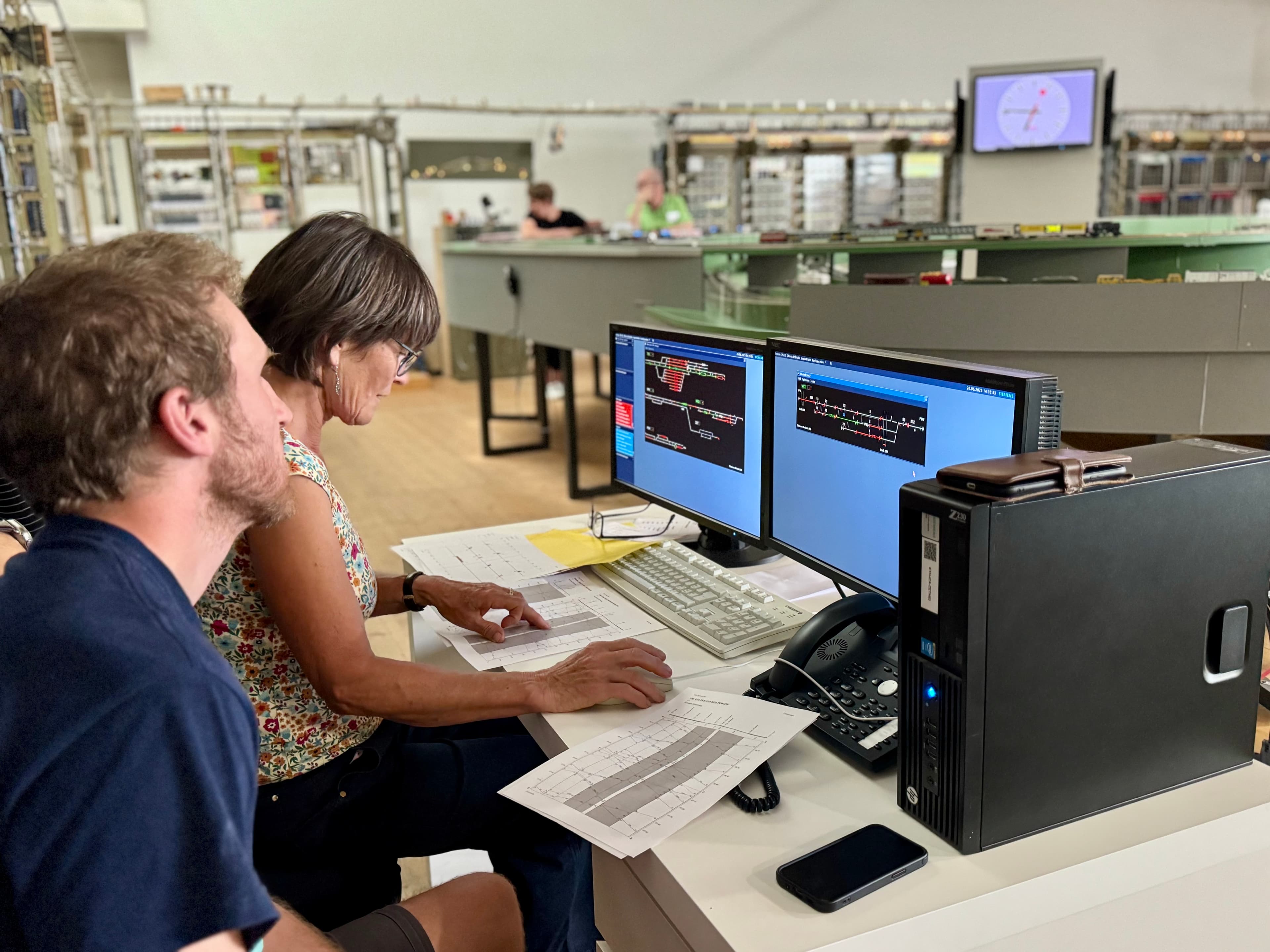 Wir starteten früh im Eisenbahnbetriebslabor Schweiz AG (ebl-Schweiz) in Dübendorf. Dort durften wir live erleben, wie Fahrpläne nicht nur in der Theorie funktionieren, sondern tatsächlich in einem detailgetreuen Modellbetrieb umgesetzt werden: Züge im Miniaturformat, Stellwerk-Action und zeitgenaue Fahrplanregelung. Für uns bei geOps – Entwickler:innen digitaler Lösungen für den öffentlichen Verkehr – fühlte sich das an wie eine spielerische Fortsetzung unserer täglichen Arbeit, nur mit echten Hebeln und Schienen.